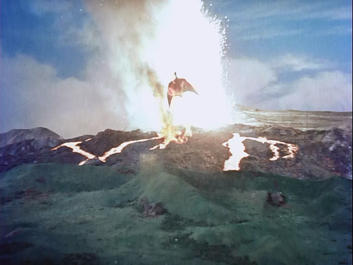 Shigeru is stationed with the army to oversee the bombardment, and Kiyo breaks away from the evacuation to be with him.  They run off to safety while the mountain continues to explode, eventually spurting some awesome-looking lava.  I’m not sure how Tsuburaya and friends pulled off this effect, but it’s a great shade of bright orange and actually catches fire when it splashes against the rocks. One of the Rodans flies out just as the volcano starts to erupt, but the other one isn’t quick enough and tumbles into the pooling lava. Then the first Rodan, the one that’s well airborne and seemingly able to get away, drops out of sky and lands with its mate in the lava.  Was it overwhelmed by the toxic gases and smoke billowing out of the volcano and unable to go on? Or did it see its mate dying in the molten rock and say “fuck this I quit”?  I say it’s up for interpretation, but Kiyo is pretty shook up by it.  The army just kind of quietly packs up and leaves, and no one says a fucking word.