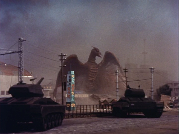 He does a move like this a second time, and it looks baller as fuck both times.  The tanks are pretty pissed at our man Rodey and pursue him, rolling over fantastic-looking miniature fences and signs. Lucky for them Rodan is a lot slower on the ground.  Unlucky for them he is just gonna keep trashing Fukuoka anyway. They periodically cut to some military brass staked out in a “safe” building, and it’s kind of hilarious because each time they cut back to them, they look a little sadder.  Then Rodan comes after them!  Then they find out there are two Rodans! Looks of sadness rapidly become looks of “oh shit we’re fucking dead”ness.