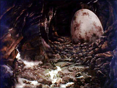 When we bounce back to Shigeru and Kiyo, he’s farting around their house recuperating and Kiyo innocently shows him that her pet bird has pooped out an egg.  This causes Shigeru to dook his drawers and flashback harder than an episode of “Lost.”  He remembers the cavernous, foggy chamber he was trapped in underground, that it was crawling with grody Mega-poo-lons, and that worst of all, there was a gigantic-ass egg on the other side of the cave.