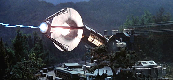The army chasing Gaira is exciting and fun, mostly due to Ifukube’s kick-ass music and welcome shots of life-size military vehicles trailing the monster.  The miniature vehicle shots look great too, except when they also feature distractingly obvious mini-drivers.  Hilarious micro-men are worth it though, because those miniature vehicle shots mean we also get to see the huge-ass maser tanks in action!