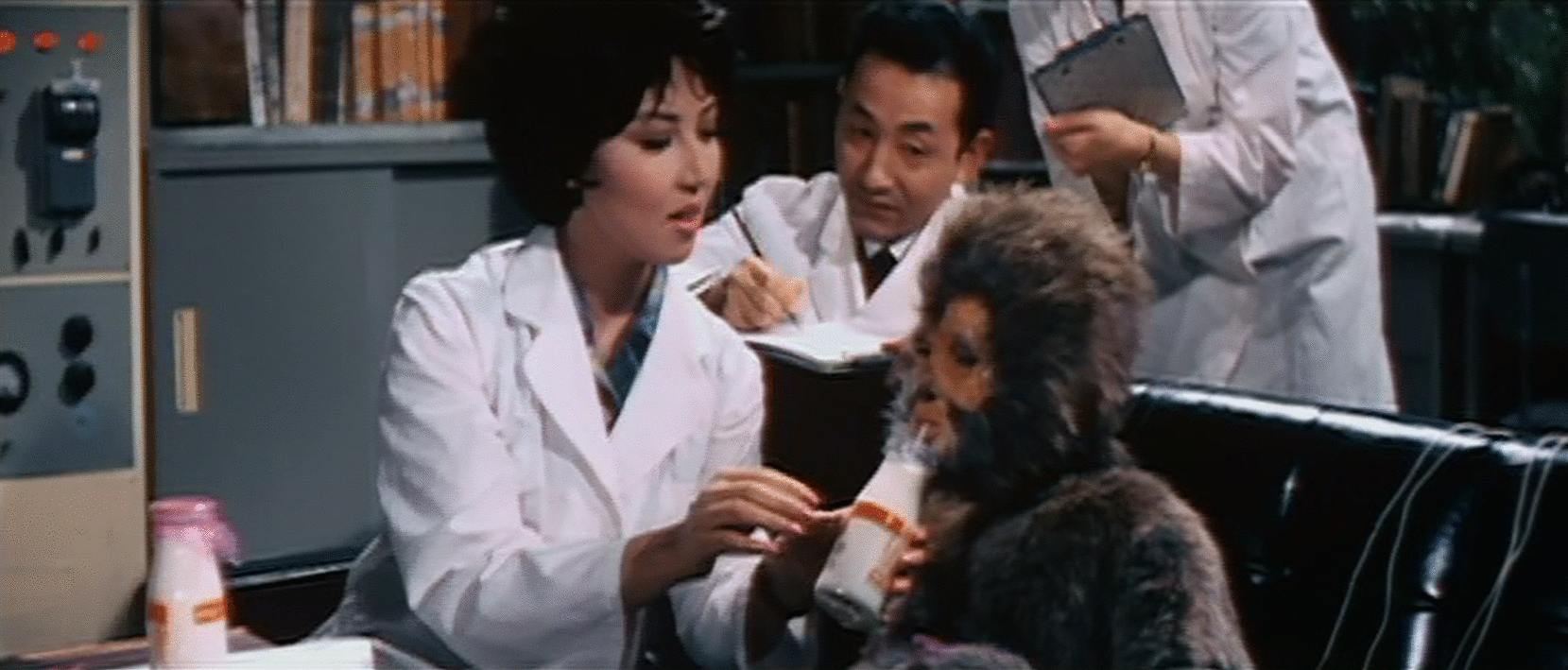As fun as it is to imagine lit professors furiously and uncontrollably liqui-turding in their pants over wacky pluralization, the Gargantuas are called Frankensteins because they actually are that monster’s weird, cellular offspring.  The Japanese and English language versions handle connections to the previous movie strangely.  The trio of scientists are new characters, unrelated to their Frankensteinian counterparts. Flashbacks show them caring not for a human-sized Frankenboy, but a ridiculously adorable little Kidgantua.