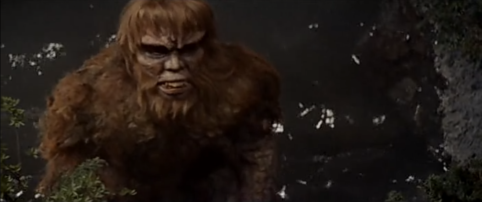 It’s enough to finally mobilize our intrepid sciencers. They tell the press they don’t believe this ugly green menace is their peaceful, people-loving babby monster from back in the day, and speculate that it may be a second creature.  Dr. Stewart and Akemi (Mizuno) head into the Japanese Alps to follow up on reports of gigantic footprints, and Dr. Majida (Sahara) investigates Gaira’s beach-side stomping grounds.  Stewart and Akemi sure as shit find some huge footprints (conveyed by a surprisingly weak matte painting), while Majida finds a hunk of monstery schmutz and has it analyzed.