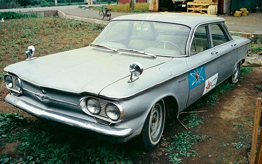 Their slumber (or attempts at it) is interrupted by an urgent call: a UFO has been spotted at the nearby science institute! Arashi, always jonesin’ for some action, hops into the Chevy Corvair to investigate and Hoshino secretly tags along! We get a really cool, dramatic shot when Arashi heads in to the institute: